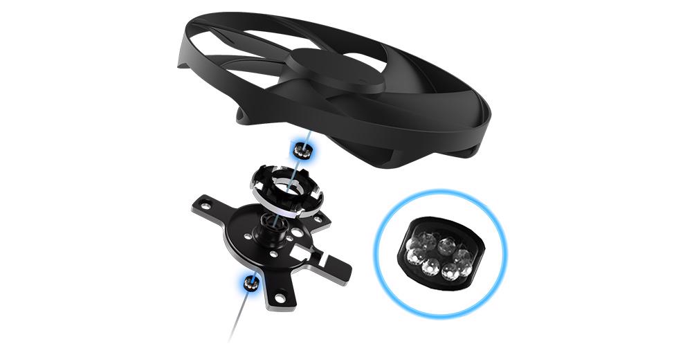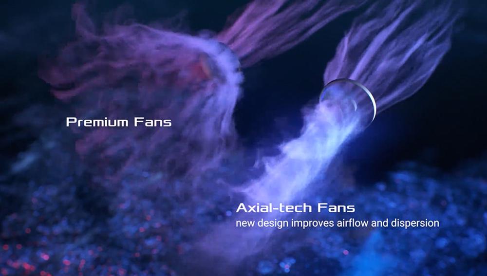 Eksen teknolojili fan tasarımında daha uzun kanatlara yer verebilen küçük bir yuva ve aşağı yönlü hava basıncını artıran bir bariyer halkası bulunuyor. ROG Strix Aura Edition PSU’lar için fan tasarımını 135 mm’ye çıkardık, bu sayede fanlar düşük devirlerde hem serin tutuyor hem de daha az gürültü üretiyor.