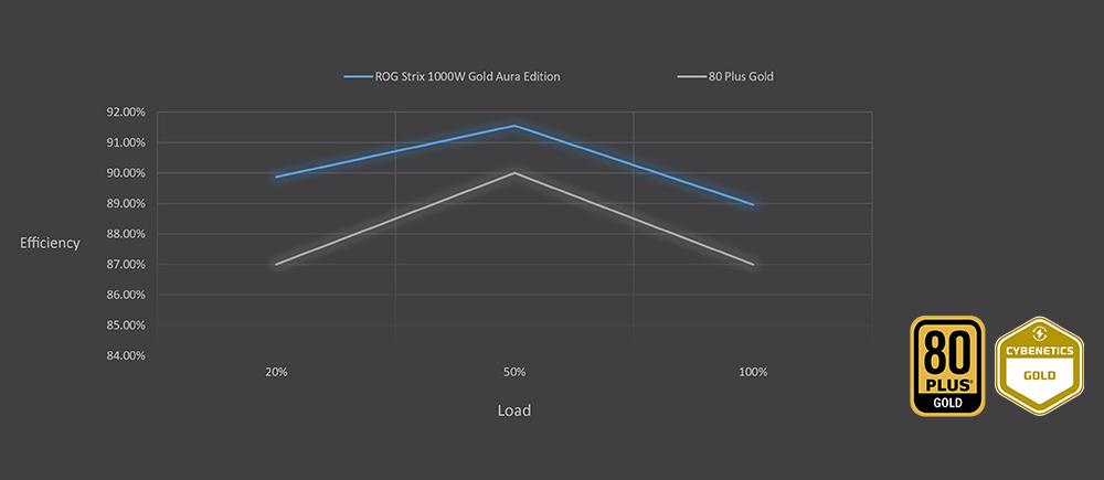 ROG Strix 1000W Gold Aura Edition ortalama olarak 20dB’den daha az gürültü çıkarıyor, bu sayede herkes tarafından istenen Cybenetics Lambda A+ sertifikasyonunu elde etti.