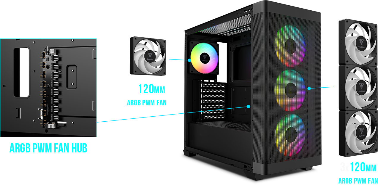 DAHİLİ FAN İLE 4 ARGB PWM FANDört adet dahili sessiz PWM ARGB fana sahip olan kasa, olağanüstü aydınlatma ve minimum gürültüyle ince ayarlı hava akışı sağlar. Dahili 8 portlu PWM ARGB fan göbeği, kolay yönetim ve senkronizasyon sağlayarak, fanların yüksek performanslı ve sessiz çalışmasını mükemmel şekilde tamamlayan uyumlu bir aydınlatma düzeni sağlar.