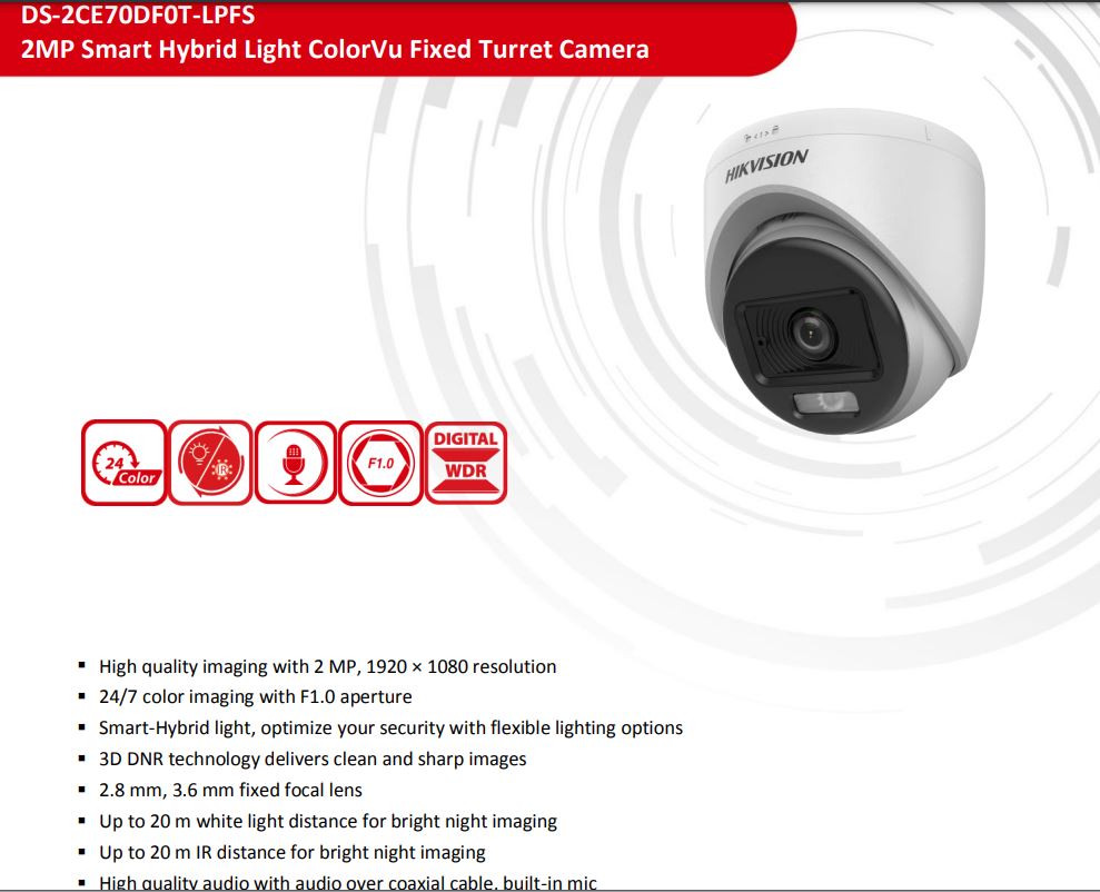 HIKVISION DS-2CE70DF0T-LPFS 2MP 2.8mm 20Mt Gece Görüşü,SESLİ,Full Color,Color Vu Dome Kamera