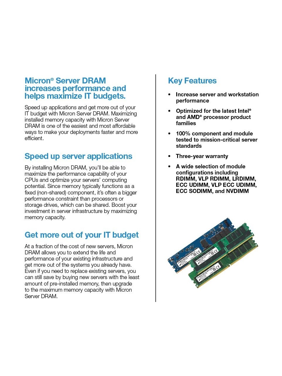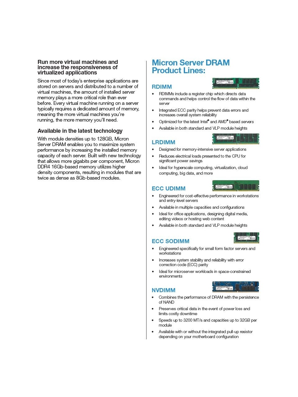 128 GB'a kadar modül yoğunluklarıyla, Micron Sunucu DRAM, her bir sunucunun kurulu bellek kapasitesini artırarak sistem performansını en üst düzeye çıkarmanıza olanak tanır. Bileşen başına daha fazla gigabit sağlayan yeni teknolojiyle üretilen Micron DDR4 16 Gb tabanlı bellek, daha yüksek yoğunluklu bileşenler kullanır ve bu da 8 Gb tabanlı modüllerden iki kat daha yoğun modüller sağlar.