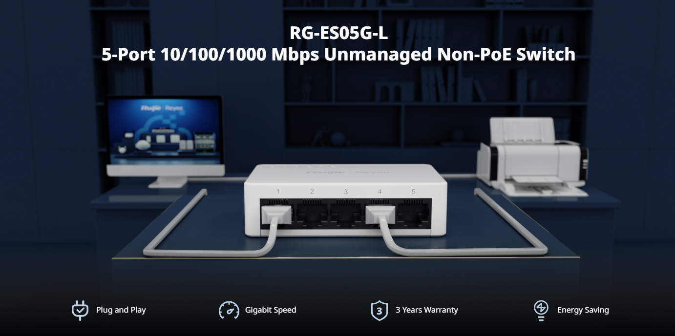 RUIJIE REYEE RG-ES05G-L 5 PORT 10/100/1000 YONETILEMEZ DESKTOP SWITCH PLASTİK KASA