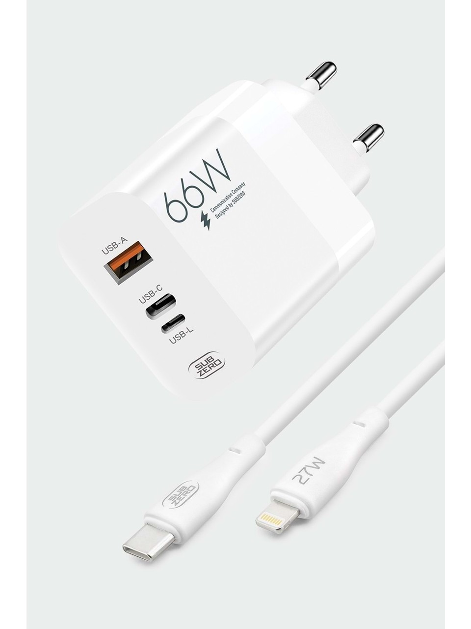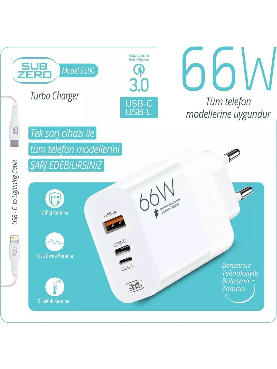 Subzero SG90 66W USB+PD+Ligtning + Type-C to Lightning Kablo Turbo Hızlı Şarj Cihazı Seti