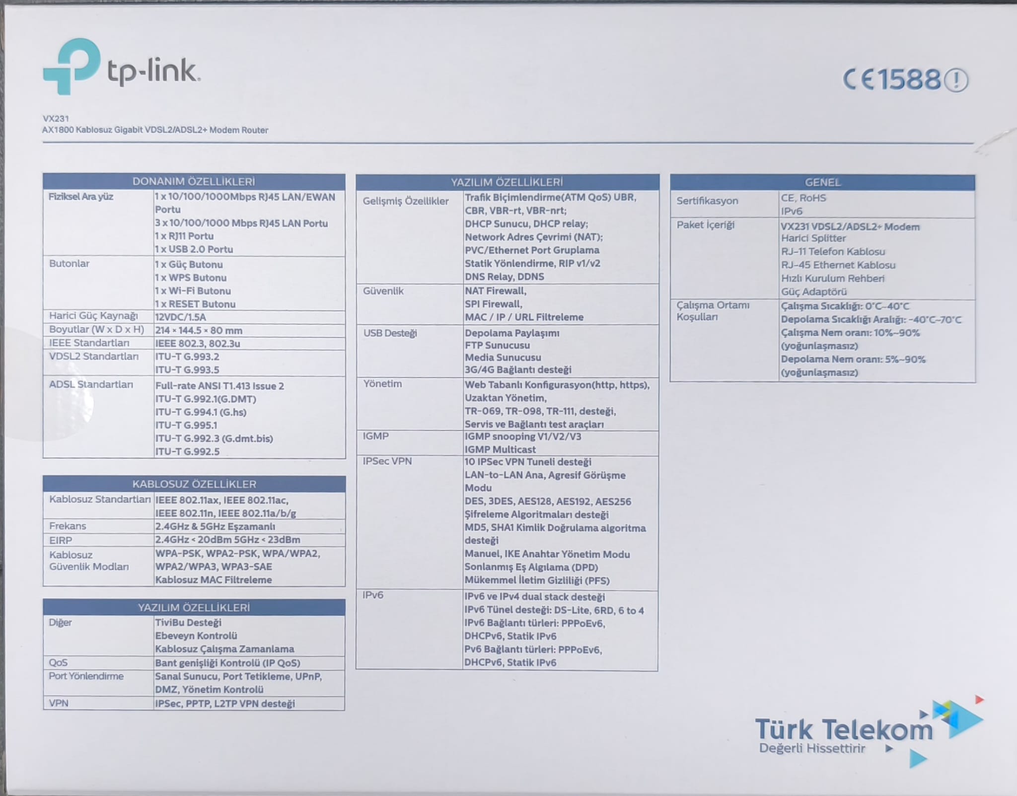 TP-Link VX231 Wi-Fi 6 AX1800 Gigabit VDSL Modem 4PORT WIFI 6 Çift-bant Wİ-Fİ özelliği. VDSL/ADSL2 AX1800