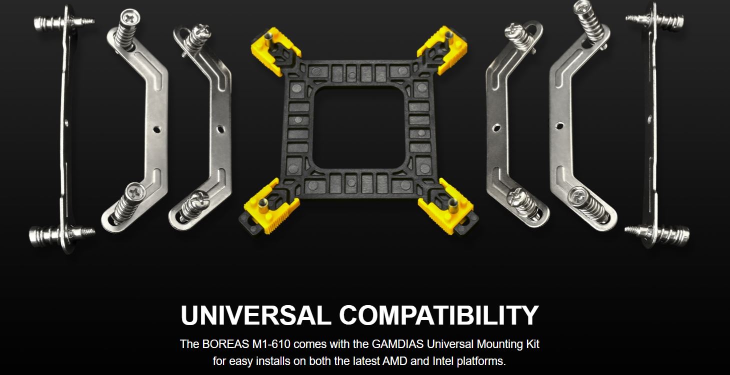 The BOREAS M1-610 comes with the GAMDIAS Universal Mounting Kit for easy installs on both the latest AMD and Intel platforms.
