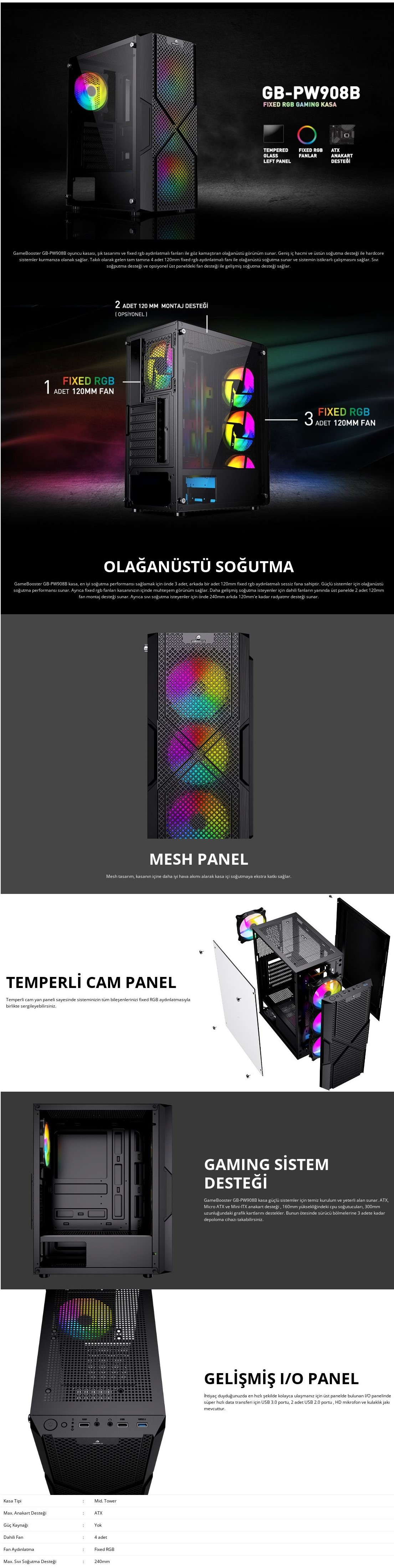 | GAMEBOOSTER GB-PW908B 650W USB 3.0, ATX Mesh, Fixed 4xRGB Fan, Siyah Kasa | |
