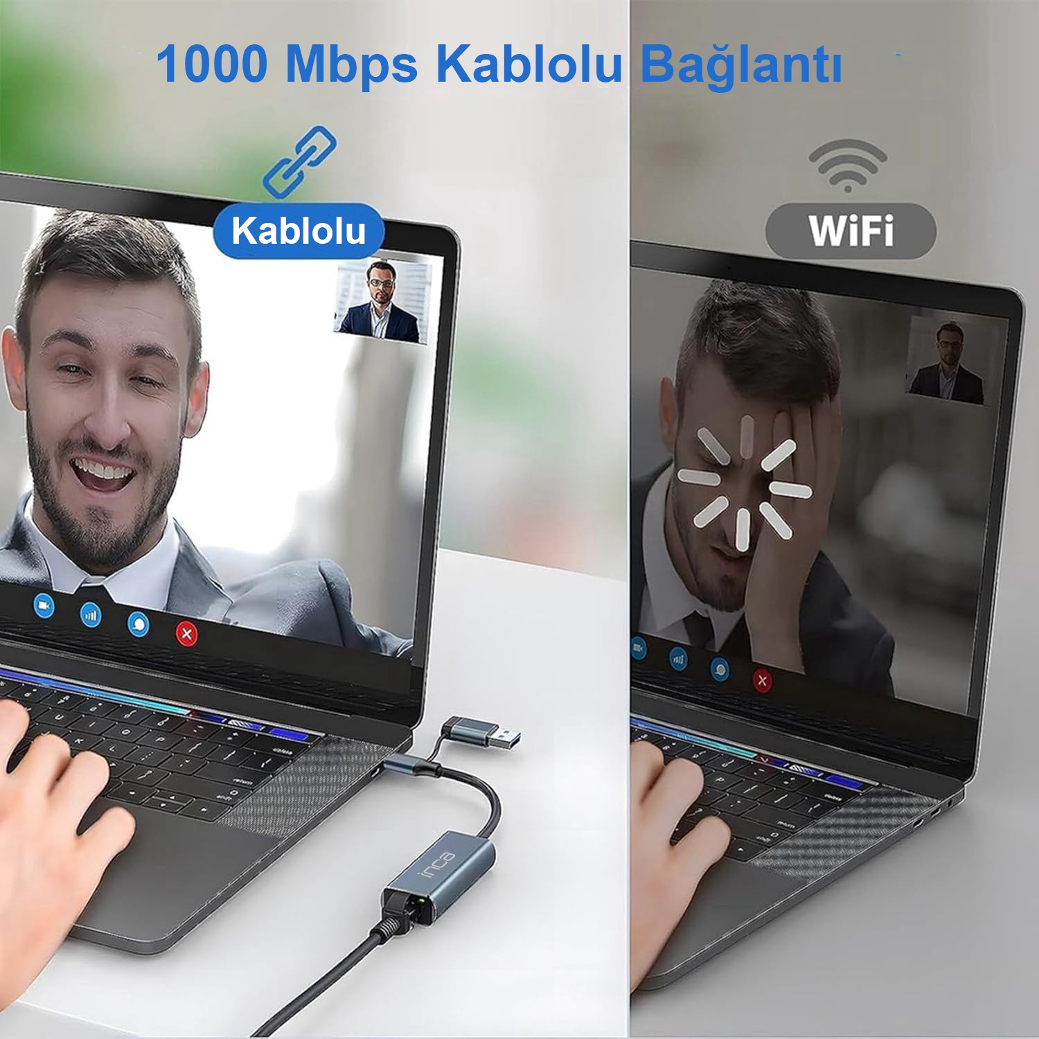 - Ethernet Adaptörü TYPE-C'den USB'ye dönüştürür.