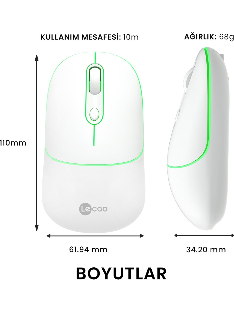 Lecoo WS210 Dual Mod RGB Bluetooth ve Kablosuz Şarj Edilebilir Optik Mouse, minimal tasarımı, kaydırmaz dokusu ve 1600 DPI hassasiyeti ile her ortamda kullanabileceğiniz, ister bluetooth üzerinden isterseniz USB alıcıyla kullanabileceğiniz bir kablosuz faredir. Ayarlanabilir 800-1200-1600 DPI hassasiyete sahiptir. Mükemmel hassasiyete sahip tuşları ile tekrar basmaya gerek duymadan işlemleri kolaylıkla yerine getirir. RGB efektleri ve çift renkli yapısı ile led ışığıyla göz alıcı şık tasarıma sahip olan Lenovo Lecoo WS210 her iki elle de tutulabilen tam olarak elinizin anatomik yapısı düşünülerek tasarlanmıştır. Sahip olduğu kıvrımlı yüzey parmaklarınızı destekler ve yorulmanızı önler. Ayrıca sessiz 'click' tuşları standart mouselar gibi tıklamalarınızda ses çıkartmaz. Böylelikle topluluk bulunan ortamlarda kullanırken hem çevreyi rahatsız etmez hem de size daha rahat bir kullanım deneyimi sunar.