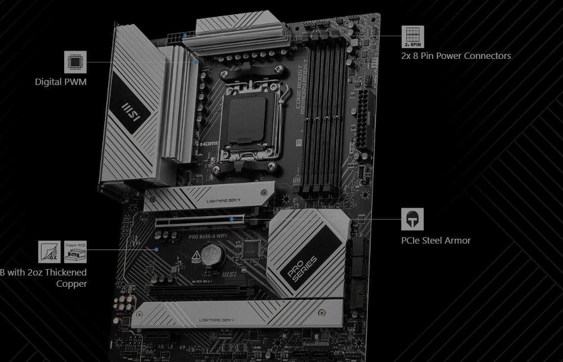MSI PRO B650-A WIFI AM5 DDR5 7600(OC) HDMI DP 3x M.2 USB 20 Gbps 2.5G LAN WI-FI 6E ATX